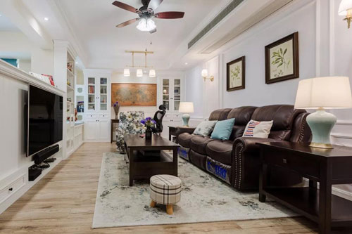 ▲ 舒服高檔的美式皮沙發,淡雅的沙發墻掛上兩幅植物裝飾畫,在吊扇燈的襯托下,整體顯得格外的優雅端莊。