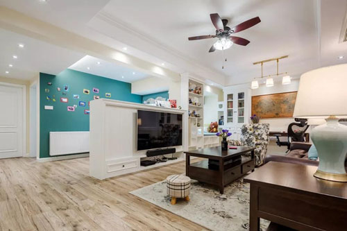 湘潭房產網2月25日訊 91平米的小房子,以溫馨優雅的現代美式風格裝修,整個設計比較大膽,以矮墻作為電視墻,把客餐廳空間劃分開來,并把電視墻后方利用成收納,實用通透又漂亮!