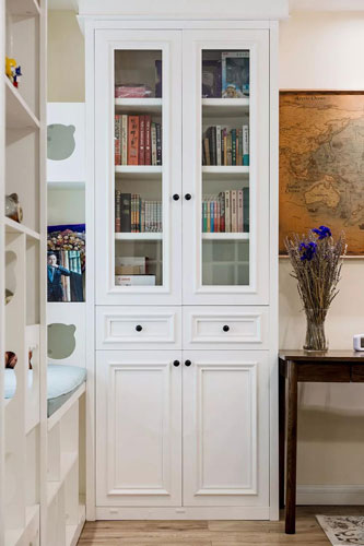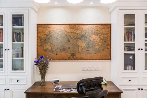 ▲ 孤島輕霧里,行舟白波上。書房兩邊分別安裝一個書柜,增加了收納空間,中間擺張書桌,墻壁上掛著一幅做舊的地圖,表達了主人對事物的廣闊胸襟。