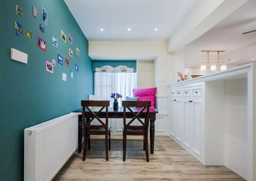 ▲ 藍綠色乳膠漆+照片墻張貼上家人們的美好瞬間,吃飯時抬頭看著也會覺得溫暖。而電視墻的后方是滿滿的收納柜,同時臺面也可以作為餐邊柜使用,獨特而又實用的巧妙設計。