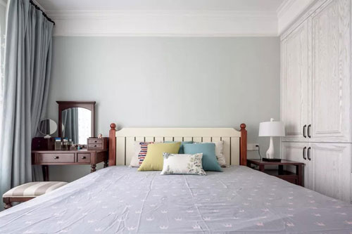 ▲ 臥室淡藍色的床頭背景墻,結合一款灰色的床單,乳白色床頭,實木梳妝臺,還有各色搭配的抱枕,整個空間都顯得格外的優雅端莊。