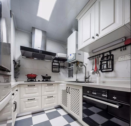 ▲ 黑白配的色調讓廚房顯得時尚現代,設計師為了方便主人使用和收納,特別制作了許多掛鉤,在烹飪的過程中,隨手可以取用各類工具。