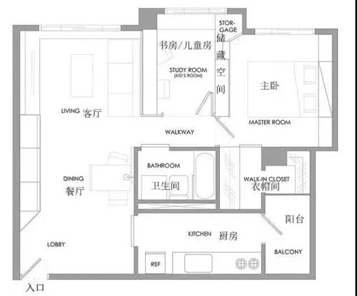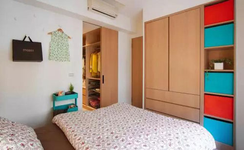 去除非承重的隔斷,打通次臥的空間,改造成兒童書房與儲藏空間。衛生間與廚房的布局不變,在衛生間一旁的,剩余空間,設計家用的衣帽間。