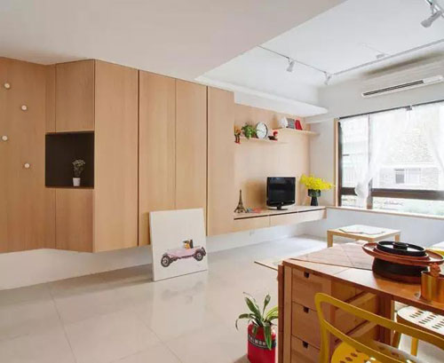 緊湊卻不擁擠的66平小家,在大白墻上,布置上木飾面。以櫥柜的形式,讓沿墻的空間得以利用。