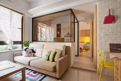沒有電視柜,用一體的隔板墻代替。客廳的陳設,極為簡約。