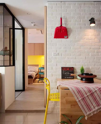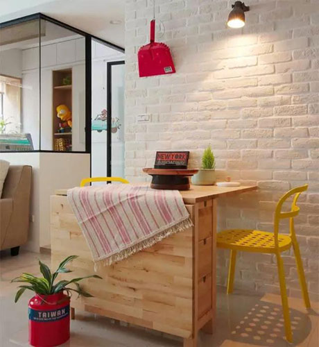 客廳旁的折疊餐桌,用白磚墻裝飾墻面。