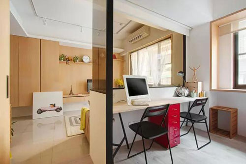 客廳旁的兒童房,留下一面墻,用作工作間。
