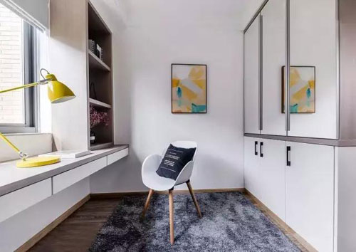 另一側做了整體式衣柜,儲存空間是必不可少的啦,上部分則利用鏡面來增強視覺的面積感,這樣的設計不會使書房太過于壓抑。
