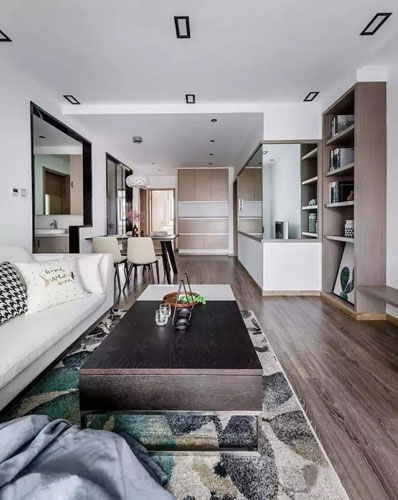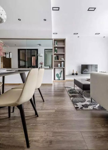 再說木白兩色拼接茶幾和電視背景墻的裝飾柜,收納能力也是爆表,在餐廳的對面墻上還有一整面的鏡子,視覺效果也很棒哦!