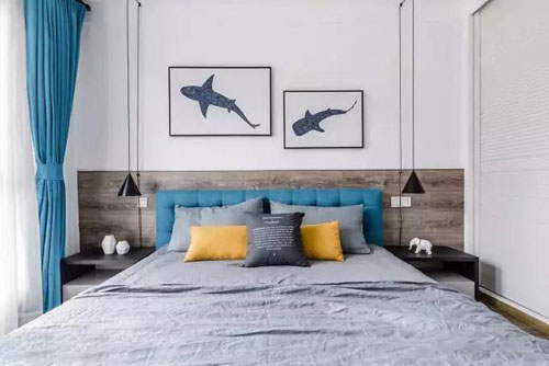 床頭有兩個非常用心的設計,就是兩邊對稱黑色吊燈,即使一方開燈看書也不會打擾到另一半,再一個床頭背景用大小不一的藍鯨魚畫做裝飾,也略顯寧靜。