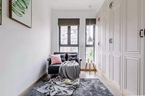 目前還沒有放置床品,所以就是一個簡單的沙發茶椅的布置,還有一個頂天立地式的白色衣柜,收納能力爆表!整體來說是明凈雅致簡約不簡單哦。
