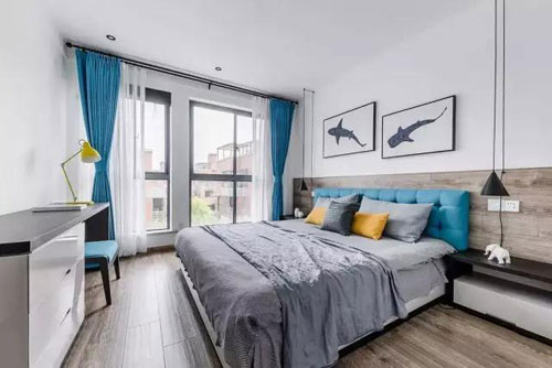 主臥也延續了整體木地板的風格,但是在床品和窗簾的選擇上使用了藍色,這樣一來視覺效果會變得更加舒適。
