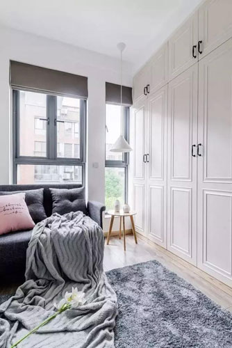 加之簡潔的搭配和溫馨色彩,以及灰藍色的床品更增添了臥室的柔軟氣息,明亮的采光也能保證臥室的舒適性。