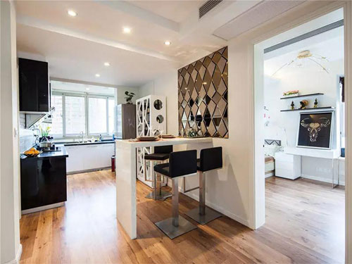 ▲小小的餐臺能滿足一家三口的用餐需要,還能兼作吧臺。一個充滿現(xiàn)代風格的裝飾柜起到了廚房和餐廳間的過渡作用。設計師還運用菱形鏡面拓展了空間深度。