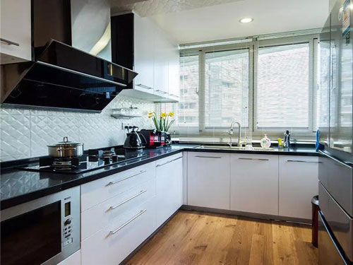 ▲簡約的黑白配,卻能碰撞出豐富、美味的一日三餐,木質地板從視覺上看擴大了整個廚房空間。