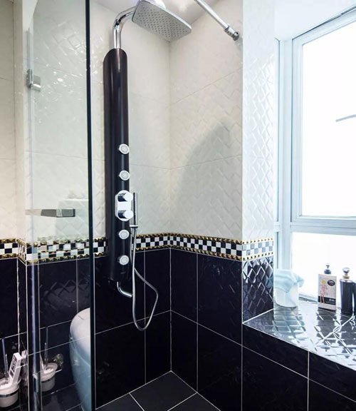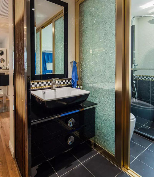 ▲衛(wèi)生間干濕分離,功能完善,古銅色金屬移門呼應了居室的現(xiàn)代風情。