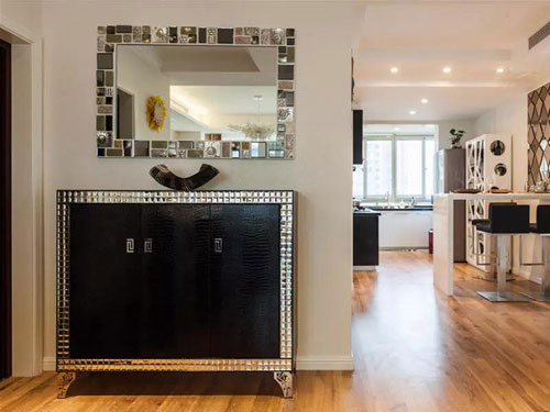▲玄關是居室具體而微的表現(xiàn),充滿現(xiàn)代感的鞋柜與鏡面,既裝飾了居室,也滿足了生活的需要。