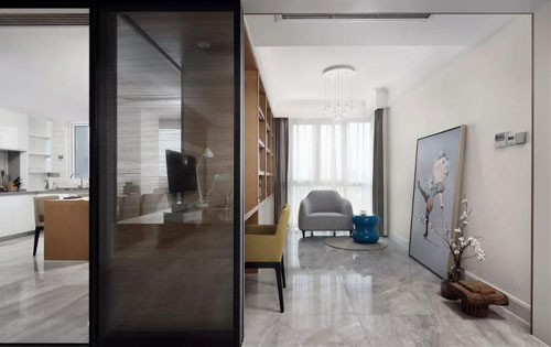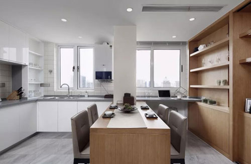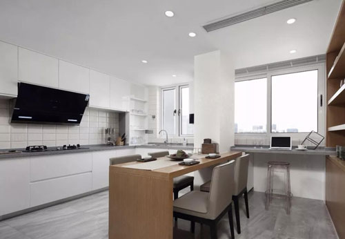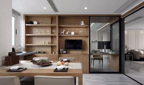 同時多功能房與餐廳玻璃移門也讓兩者之間出現更多的可能性,讓廚房餐廳與外界空間可以靈活組合變化,餐桌與櫥柜的結合,早餐吧臺的出現,產生生活狀態的畫面感!