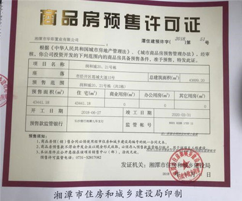 經審核,湘潭市華彩置業有限公司在市經開區蓮城大道15號開發建設的潤和城20、21號棟(共2棟)預售建筑面積43441.18平方米,符合商品房預售條件,現湘潭市住建局以潭住建預許字(2018)第51號《商品房預售許可證》批準預售。