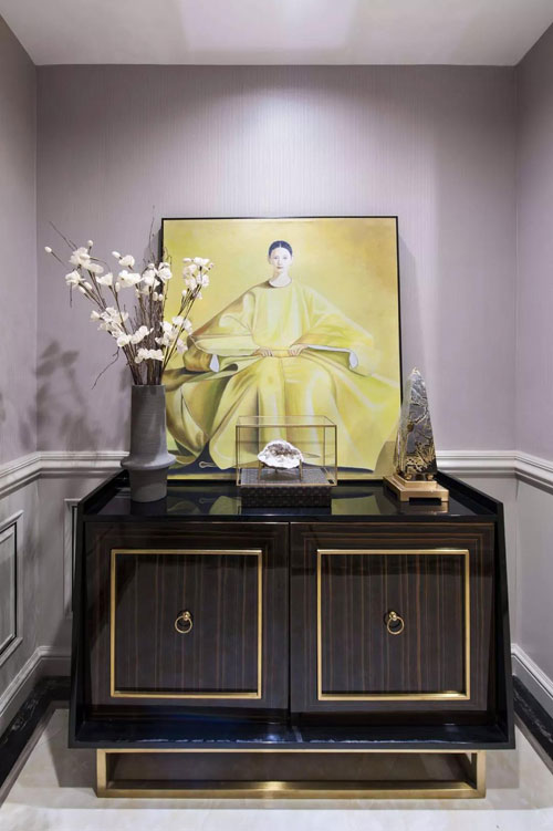 整體硬裝是英式風(fēng)格,主要體現(xiàn)在深色大理石板材和米黃色磚材,還有大量的高級灰木飾面來調(diào)和整體硬朗的材質(zhì)色彩。軟裝整體色調(diào)是以米色、黑色和灰色為主色調(diào),木色作為點綴色。