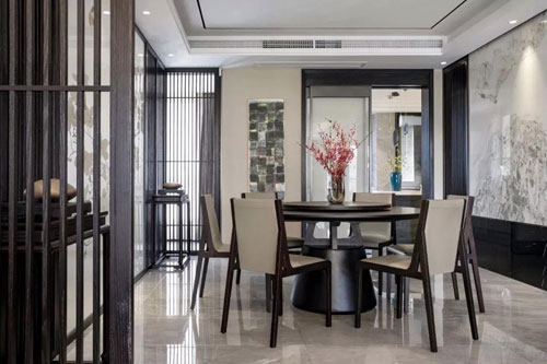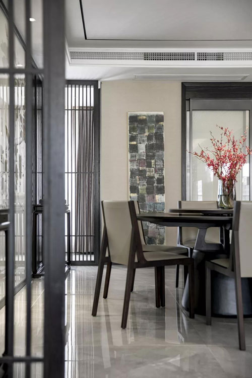 餐廳、茶室、書房均不設(shè)門,呈半敞開式空間形態(tài),實木鏤空隔斷穿插其間,動線分明。踏步而來,隱隱約約,曲徑通幽。而這隔而不隔,界而未界,還增加了情趣,豐富了視覺。
