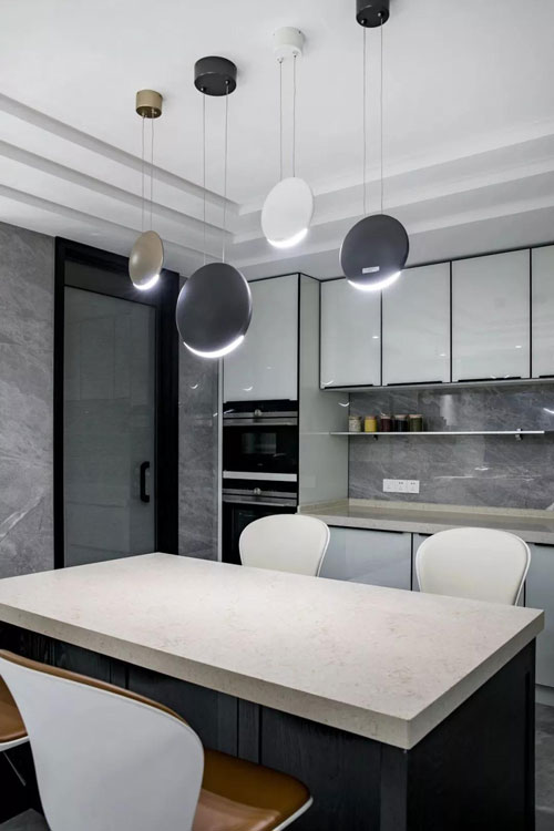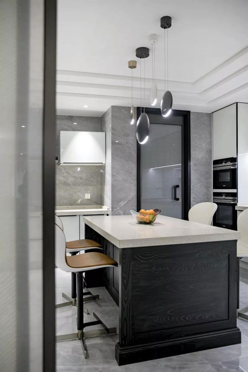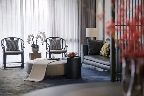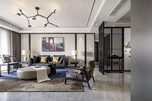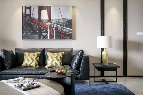 客廳是現(xiàn)代與中式風(fēng)格碰撞最激烈的地方。極具現(xiàn)代感的黑色皮質(zhì)沙發(fā)與中式的深棕紅木圈椅,巧妙的搭配一處。現(xiàn)代家具的隨意性被收斂些許,中式家具的冷硬沉寂被恰巧喚活,一收一放將兩者巧妙結(jié)合。客廳電視背景墻選擇了山水紋的天然大理石,恰似一幅中國水墨山水畫,與沙發(fā)后美國紅色金門大橋照片形成反差。