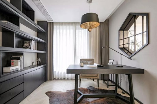 書房里有一整面實木打造的書柜,暗黑的色調(diào),沉靜輕奢。各種書籍陳列其上,不經(jīng)意間流露出主人的好品味。柔軟的棕毛地毯,將腳步聲隱藏,給主人安靜的書寫和閱讀空間。