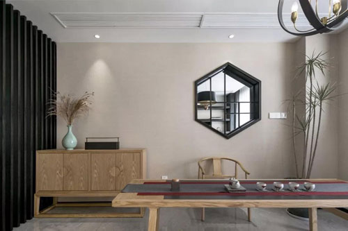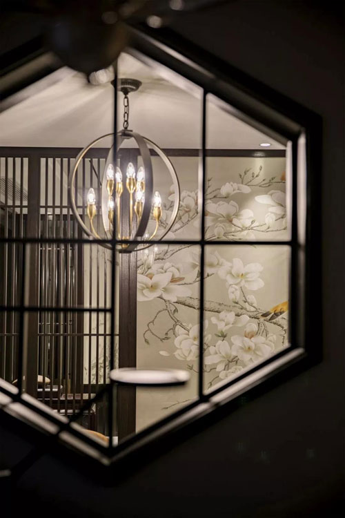 設(shè)計師獨具匠心,在茶室墻上開了一面六角格子窗。原本的書房相對封閉,而格子窗不僅使內(nèi)外空間相互滲透,還增加了書房的空間感。透過窗,將茶室和白玉蘭屏風(fēng)形成微縮景觀。這種做法借鑒了中國蘇州園林傳統(tǒng)的借景與框景的手法。