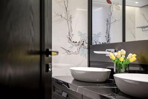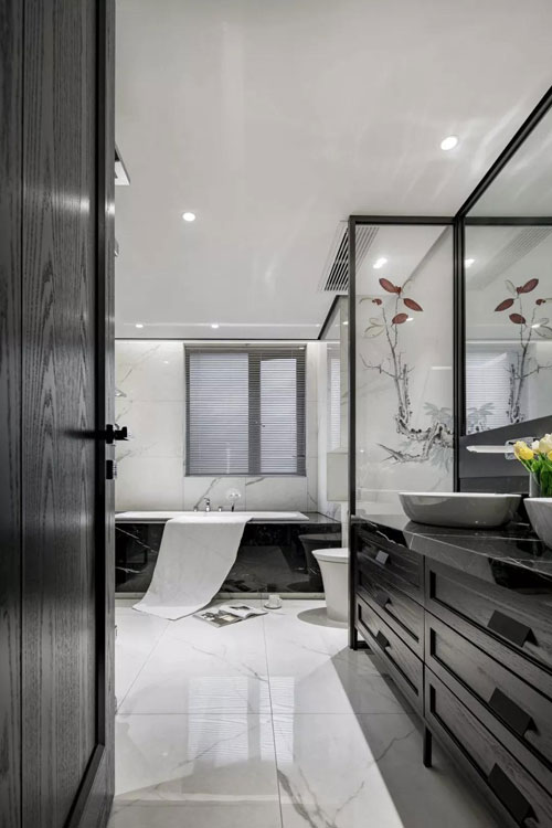 主衛(wèi)生間以黑白分明的簡雅為主調(diào),將絹畫上的一抹紅映襯得更為嬌艷,正體現(xiàn)了主人對精致生活的一份追求。墨色古韻的畫作與花卉元素始終貫穿于室,縈繞著主題意境,更為本案多添了幾分靈動生機。