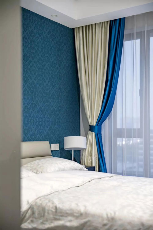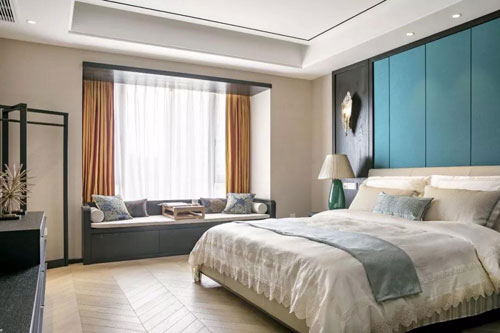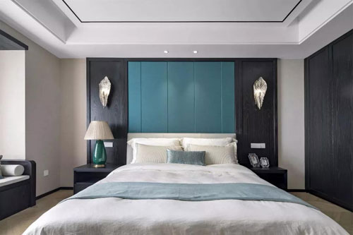 主臥的床品也增添了中式的設(shè)計。松花綠色的床頭臺燈,艾綠色的床尾巾,靛藍色的抱枕,其中又佐以中式工筆畫的花卉圖案,提升了臥室整體的雅致格調(diào)。真絲材料的硬包背景和窗簾,更有質(zhì)感的突顯。
