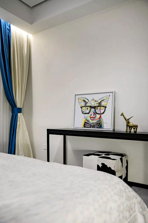 女兒的房間簡單干凈,窗簾是寶藍色與鵝黃色的亮色搭配,飽滿的顏色配上設(shè)計簡潔的床柜、桌椅,使房間的格調(diào)清新明朗。擺放在桌上色彩斑斕的油畫豬,鎏金的小鹿,黑白奶牛紋的正方形座椅,都處處彰顯著年少與青春。