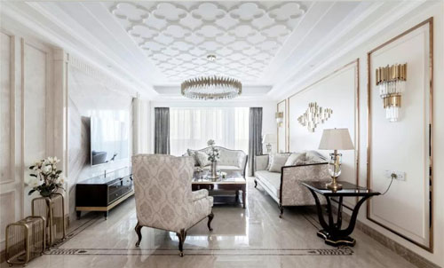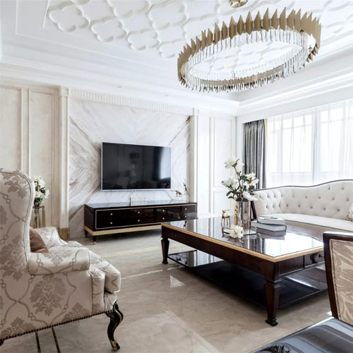 1客廳電視墻的切割方式,藍金沙大理石的對紋拼接給客廳增添了幾分的律動,客廳吊頂的四葉草“幸運草”的PU定制線條再加上盞簡潔輕奢的水晶吊頂,幸福,幸運,與永恒并存。