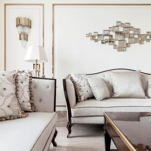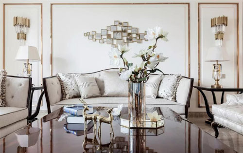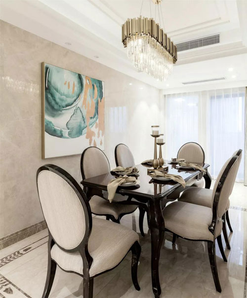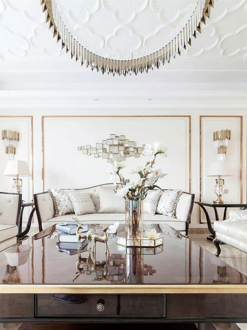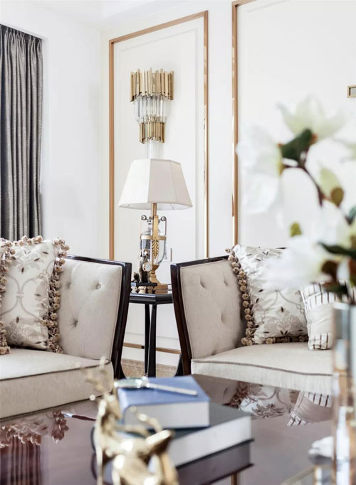 在客廳空間中,當氣質高貴的白玉蘭大理石,與鑲嵌玫瑰金的米色護墻板產生碰撞,營造出儒雅高貴的氣質。氣質與溫暖,兩者關系相輔相成、相得益彰,不僅呈現了空間主人真正想要的“家的溫度”,更是品質生活方式的藝術呈現。
