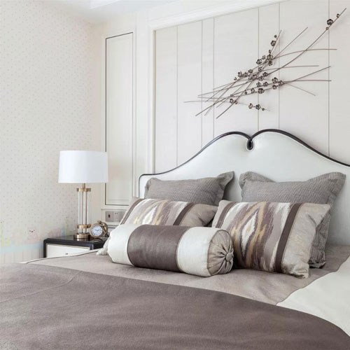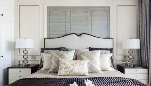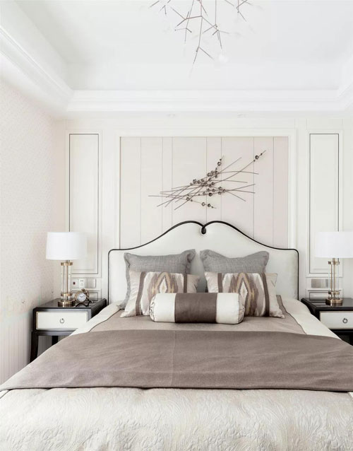 主臥設計中,極致的展現了“柔美”。使用米白色護墻板和中性灰的硬包,讓整個空間充滿了溫馨和舒適的感覺。