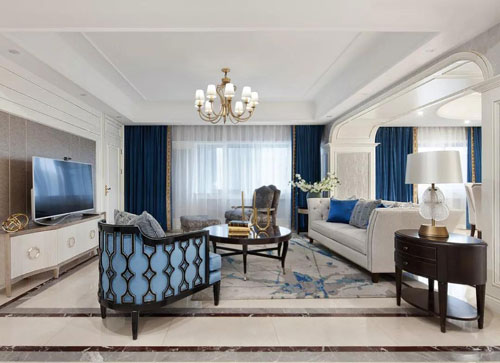軟裝配飾的選擇也使整個空間歐式情懷濃郁,黑白,藍色,咖色色彩搭配則讓客廳區域更顯一份活潑與悅動。