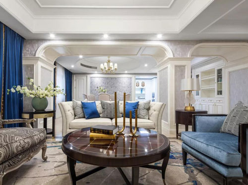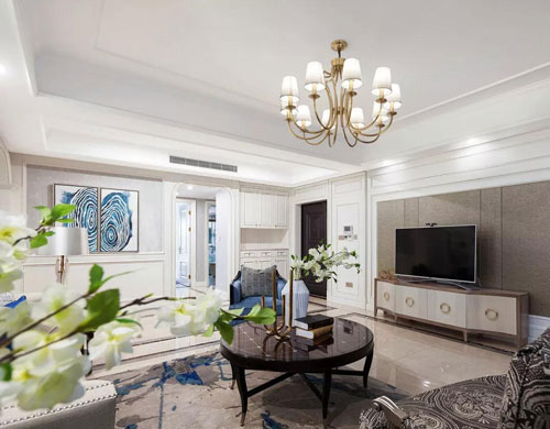 湘潭房產網訊 客廳區域設計師運用木飾面與硬包結合,無論是從色彩上還是形態上都豐富了空間層次感,歐式的奢華格調也更為突出。