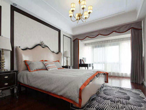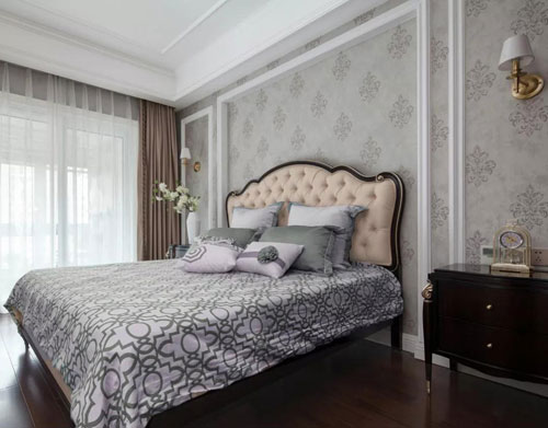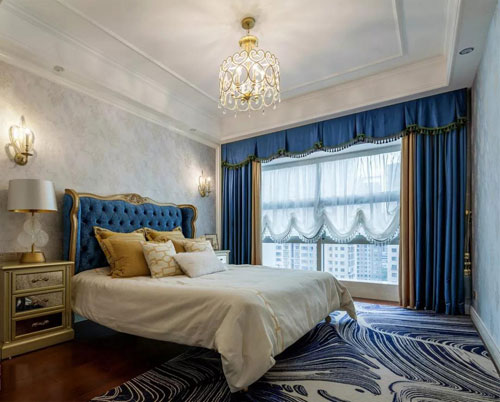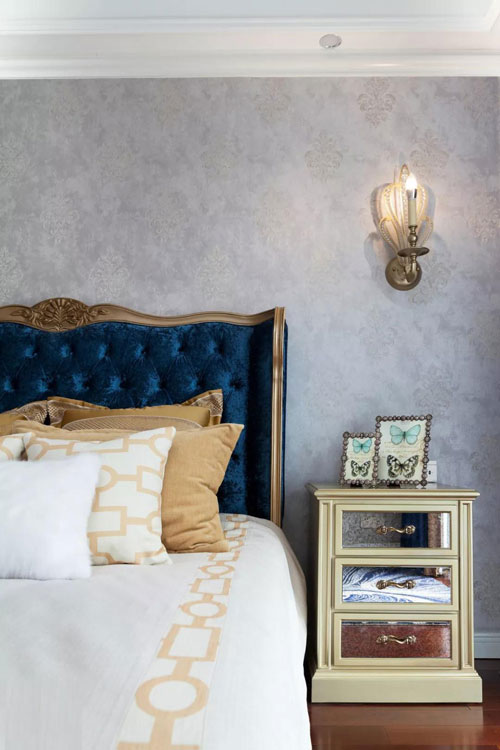 主臥選了一張藍色宮廷風大床,更吻合空間主人的格調,襯托出古典家具的高貴與優雅。柔和的淺色墻布為整個空間帶來了柔美的氣質,給人以舒適、溫柔的視覺感受。