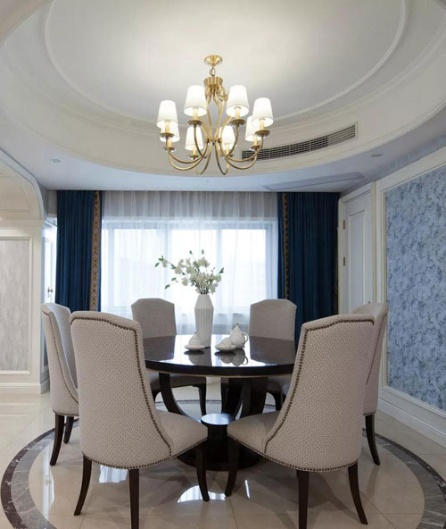 餐廳運用與整體空間的優雅基調所契合的墻布,低調,不顯張揚,圓形吊頂與實木圓餐桌相呼應,凸顯古典情調。