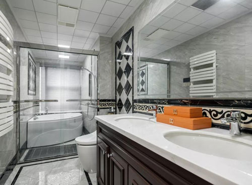 衛生間深色柜子與淺色臺面的結合,優雅不失情調,歐美元素融于每個細節之中,更體現精致古典的格調。