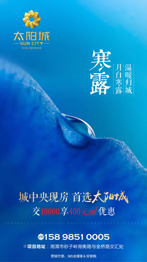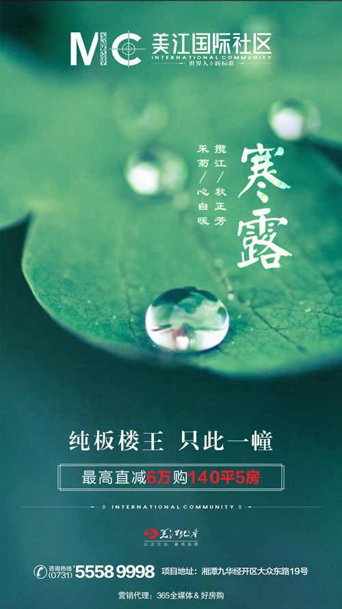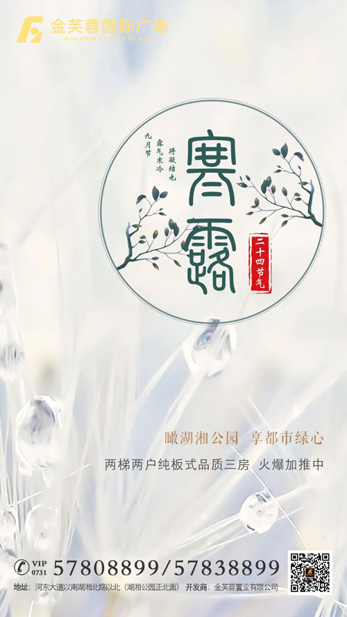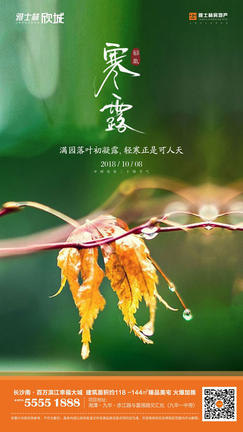湘潭房產網10月8日訊 寒雨幽來驚入夜,一簾珠露似殘秋!寒露是二十四節氣中的第十七個節氣,屬于秋季的第五個節氣,預示著秋季時節的正式開始。寒露之后,氣溫不斷下降,氣候從涼爽過渡到寒冷,這也意味著,寒露之后,天氣將會越來越冷,這時,一處溫暖的歸宿就更顯得尤為重要了。所以想要買房的購房者們,趁著天氣還沒有特別冷,趕緊出門看房買房去吧。