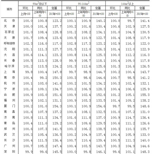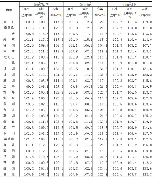 在9月份70個大中城市新建商品住宅銷售價格分類指數變動情況中,在90㎡以下的面積區間中,西安的新建商品住宅銷售價格環比上漲了6.7%,位列70城第一,三亞的新建商品住宅銷售價格同比上漲了21.7%,位列70城第一;在90-144㎡的面積區間中,西安的新建商品住宅銷售價格環比上漲了6.0%,位列70城第一,海口的新建商品住宅銷售價格同比上漲了23.5%,位列70城第一;在144㎡以上的面積區間中,西安的新建商品住宅銷售價格環比上漲了6.1%,位列70城第一,海口的新建商品住宅銷售價格同比上漲了20.9%,位列70城第一。