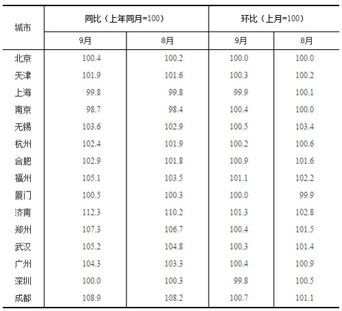 在15個熱點城市新建商品住宅銷售價格變動對比表中,濟南9月份同比上漲了12.3%,環比上漲了1.3%,均位列15個熱點城市第一。