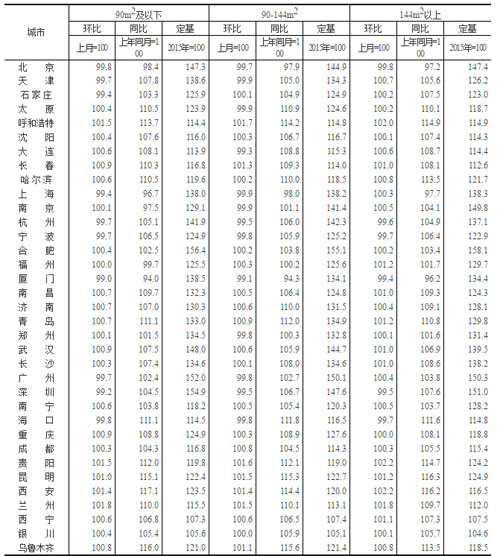 在10月份70個大中城市新建商品住宅銷售價格分類指數變動情況中,在90㎡以下的面積區間中,貴陽的新建商品住宅銷售價格環比上漲了4.7%,位列70城第一,西安的新建商品住宅銷售價格同比上漲了20.6%,位列70城第一;在90-144㎡的面積區間中,貴陽的新建商品住宅銷售價格環比上漲了3.8%,位列70城第一,海口的新建商品住宅銷售價格同比上漲了24.4%,位列70城第一;在144㎡以上的面積區間中,貴陽的新建商品住宅銷售價格環比上漲了4.4%,位列70城第一,海口的新建商品住宅銷售價格同比上漲了21.0%,位列70城第一。