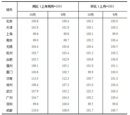 在15個熱點城市新建商品住宅銷售價格變動對比表中,濟南10月份同比上漲了13.3%,位列15個熱點城市第一。武漢10月份環比上漲了2.5%,位例15個熱點城市第一。在15個熱點城市中,上海、南京、深圳三個城市10月份新建商品住宅銷售價格同比下跌,廈門、深圳兩個城市10月份新建商品住宅銷售價格環比下跌。
