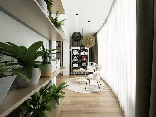 深綠色的窗簾可以在遮蔽陽光的同時與綠植遙相呼應,植物通過光合作用使室內空氣更加新鮮。“鳥歸巢、人思鄉”,鳥巢型的吊燈體現了主人的思鄉之情以及渴望在都市中尋求一份靜謐的渴望。