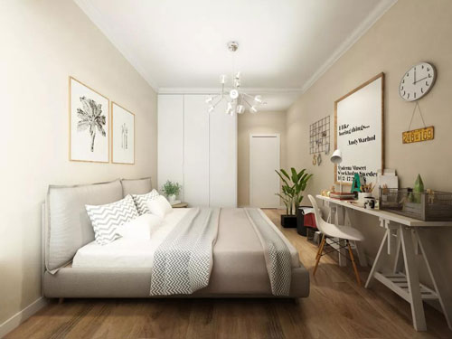次臥整體簡單卻不失溫馨,亞麻織布的床靠,生活氣息濃重的書桌,使整個房間看來舒適而溫馨。