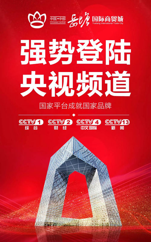 即日起,中國(中部)岳塘國際商貿城將火力全開,不僅全面亮相央視各大頻道,還將登陸《湖南衛視》、《湖南經視》、《湖南都市頻道》、《湖南電視劇頻道》、《長沙政法頻道》等多個省級頻道,展現中國(中部)岳塘國際商貿城“智慧商都 中國岳塘”宏圖,敬請期待!