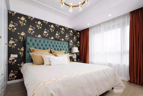 ▲ 主臥的墻面,設計師選用黑底墻紙與錯落的花紋結合,讓臥室披上了雅致氣息。
