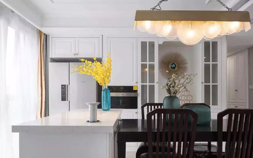 ▲ 餐廳的島臺設計讓空間實用性更強,可以在這個開放式的空間里為孩子準備美食,增強空間的互動性。一整面墻的儲物柜不僅納入了冰箱和烤箱,還提供了強大的收納功能。
