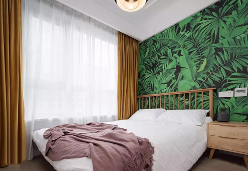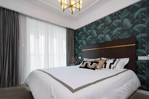 ▲ 次臥的墨綠色枝葉墻紙,使得整個空間帶有了一絲神秘感,軟裝選用黑白灰讓次臥更有氣質,整體更為時尚。